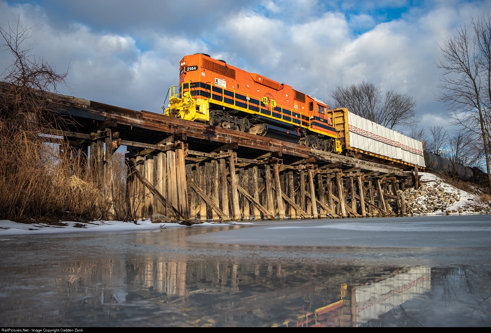 The MMRR crew runs LHF westbound over the Swan Creek with 16 cars.