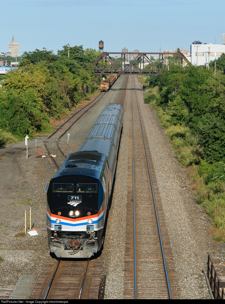 | Amtrak 281 speeds away from Rochester, New York behind P32AC-DM 711 after making its station stop downtown. The train has passed under the R&S Belt Line bridge is about to cross over the Erie Canal as it heads west. |