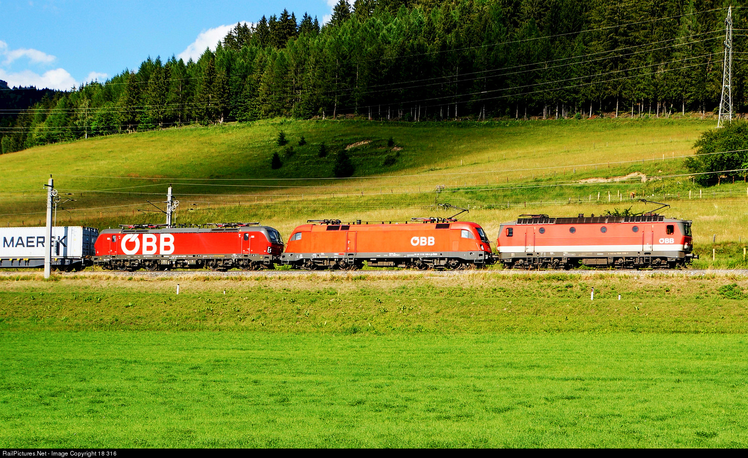 | Three generations on the same train: ÖBB 1144 239 (delivered in 1992), 1116 126 (delivered in 2003) and 1293 007 (delivered in 2018), hauling a container train, almost reached the summit of the Neumarkter Sattel incline out of the valley of the Mur river on Austria's Rudolfsbahn line. |
