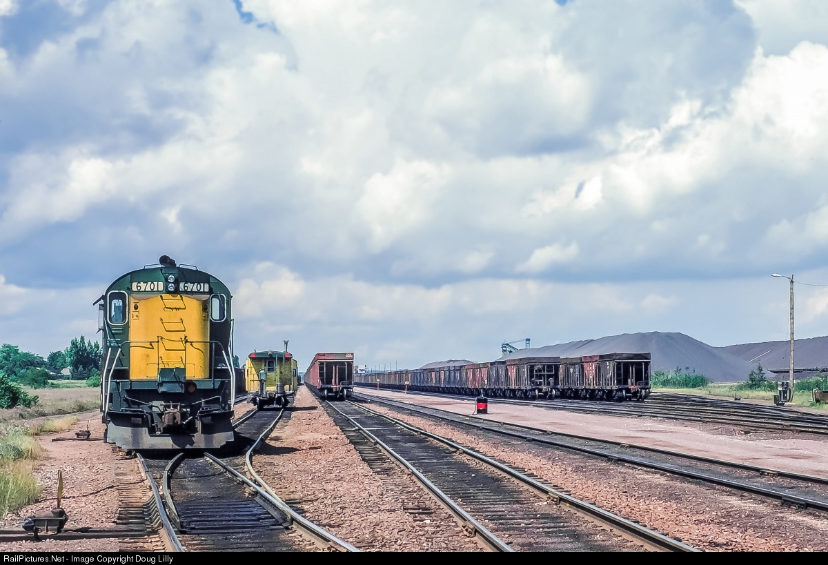 The Chicago & North Western ore yard at Escanaba, Michigan, seems to have been divided int a load arrival yard on the left, and an empty departure yard on the right, The C628 on the left has just filled one of the arrival tracks.