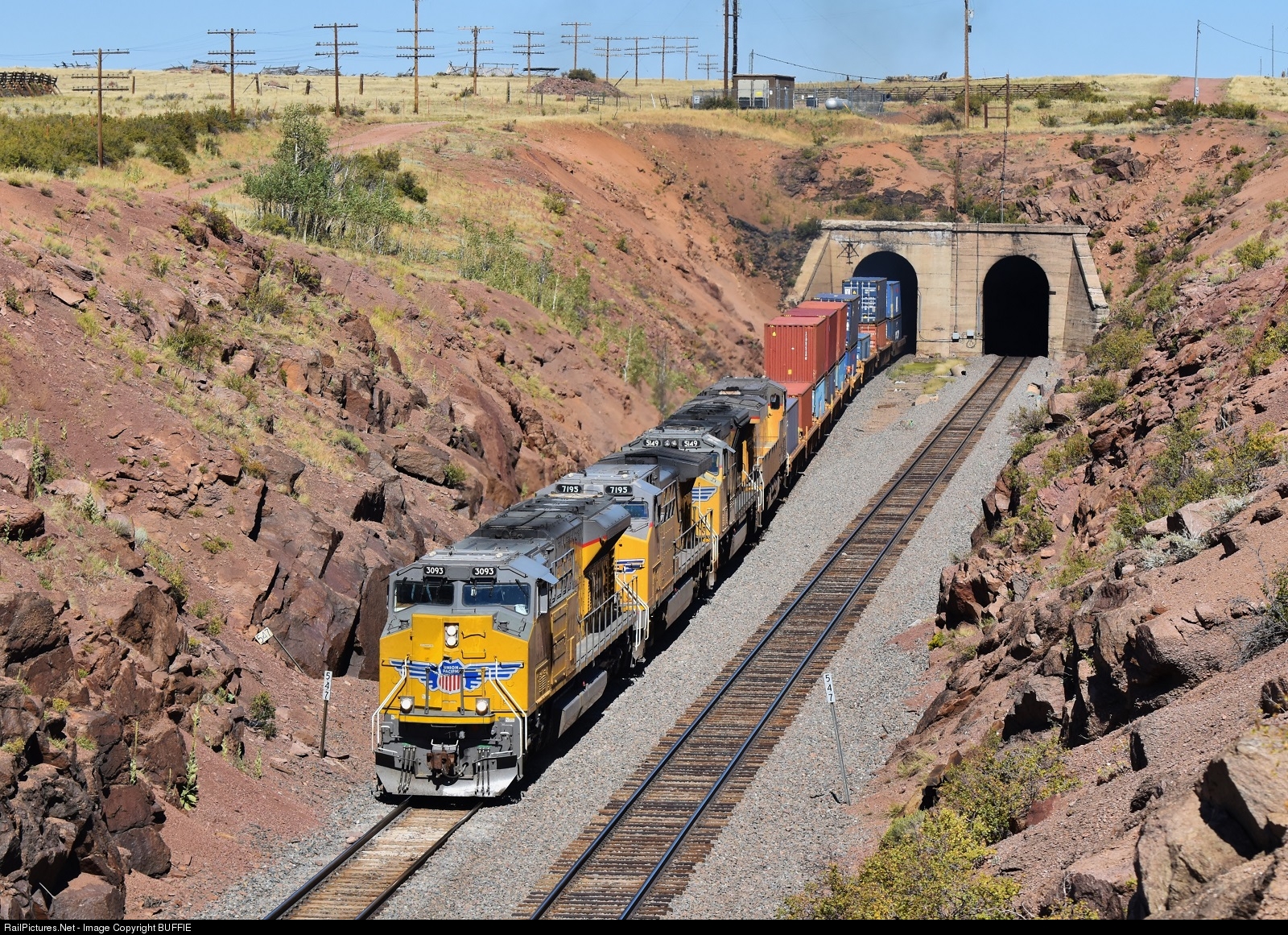 A fresh looking UP 3093 (SD70ACe-T4) leads a stack train out of the Hermosa Tunnels on their way to Laramie, Wyoming.