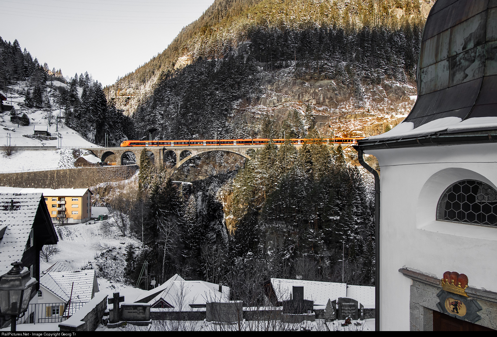 | View from the cementary of Wassen church to the middle Meienreuss bridge of the Gotthard line. A TRAVERSO RABe 526.1 of the Südostbahn (SOB) is running the Interregio 2320 of the line IR 26 "Treno Gottardo" from Bellinzona via Airolo-Göschenen-Arth Goldau-Lucerne-Olten to Basel over the 122 meter long and 70 meter high viaduct. |