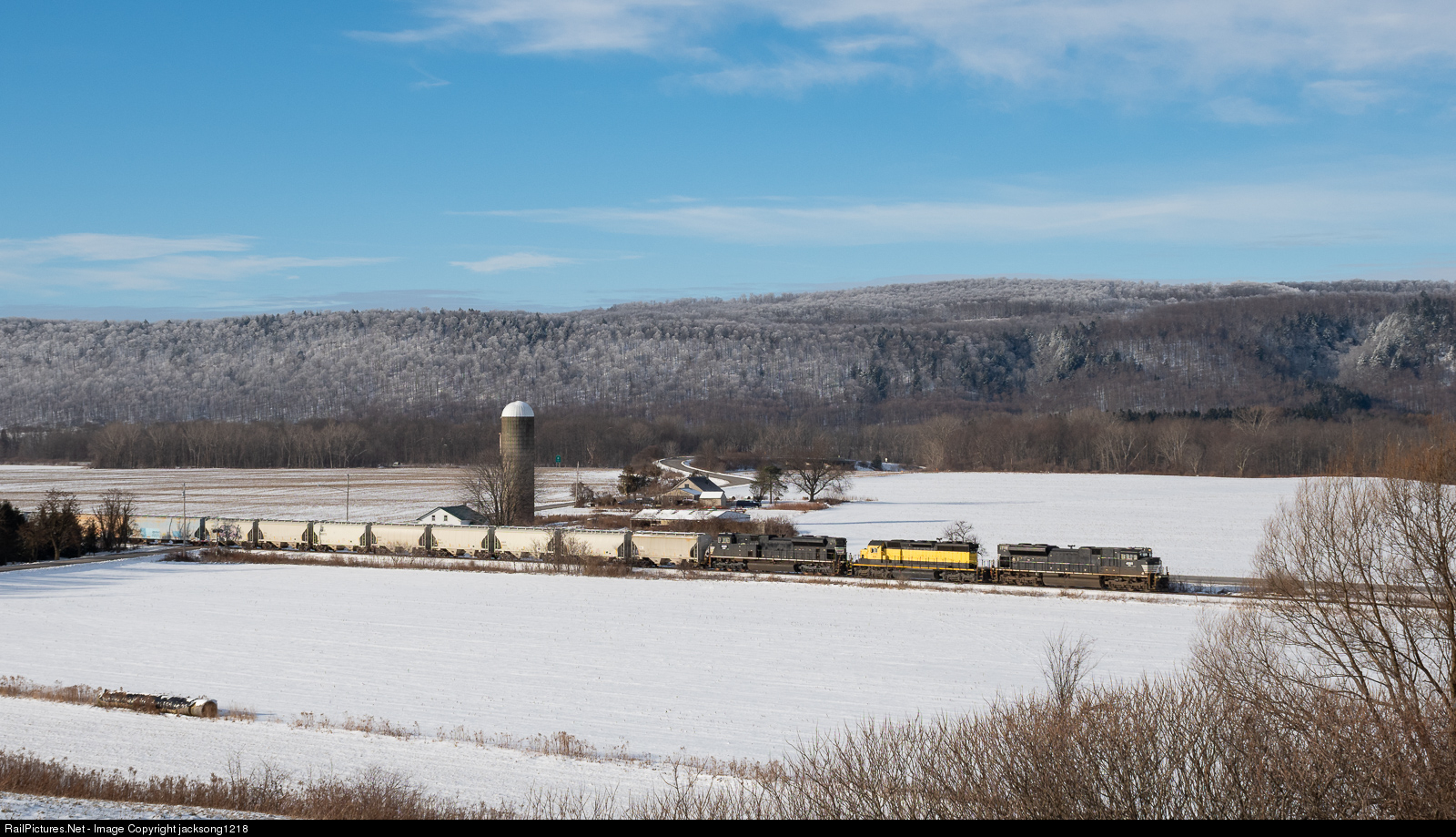 With a fresh dusting of snow covering the trees on the hills, New York Susquehanna and Western train CL-1 (Cortland, NY - Syracuse, NY turn) heads northbound through the farm fields of Tully, NY. NYSW has recently purchased four EMD SD70M-2s from Norfolk Southern, and 4060 (ex NS 2751) and 4066 (ex NS 2758) can be seen on this train.
