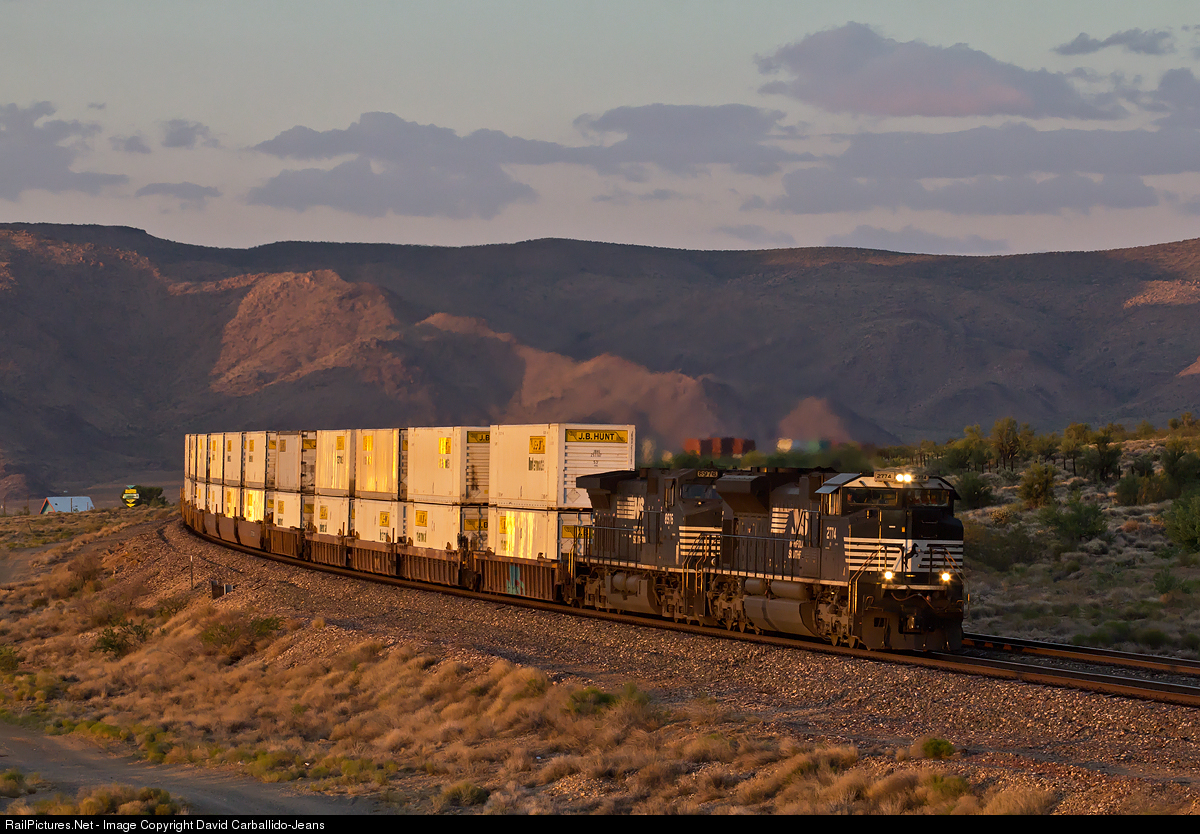 | A pair of NS motors lead the New York, NY (NS) to Los Angeles, CA guarantee service intermodal train around the 70 MPH curve of Antares along BNSF"s Seligman Subdivision. |
