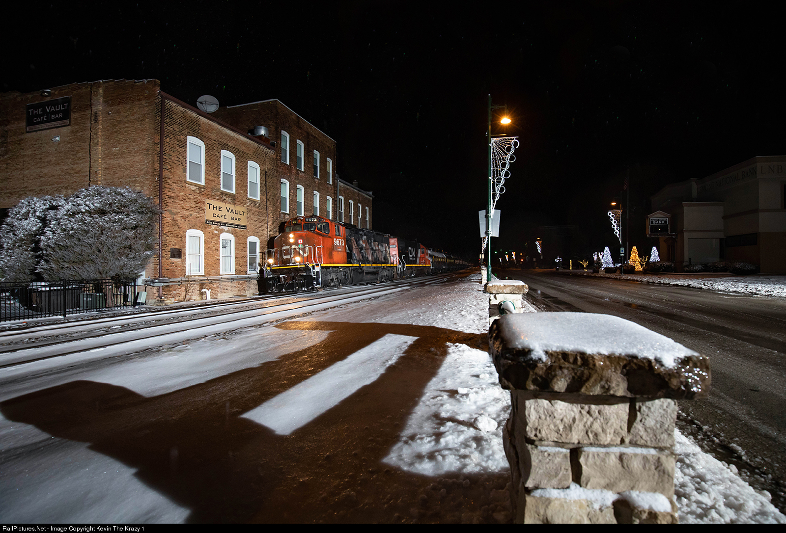 | As the snow transitioned into rain, CN's L545 Millsdale Job is seen passing through downtown Lemont with a Zebra GP40-2LW doing the honors tonight. |