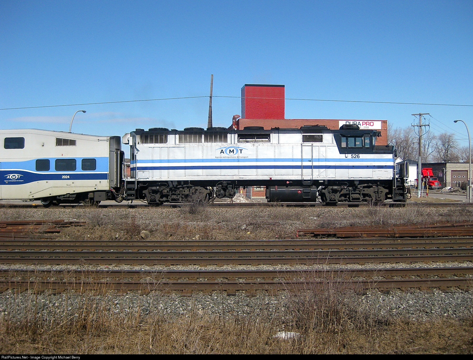 | AMT 526 leads an eastbound through Dorval. This ex-GO Transit F59PH is now used by Metra as METX 97. In between the CN and CP main lines here is where an interchange track was in place till a couple of years before this picture was taken. There's a good chance the rails between the two lines are from the interchange track. |