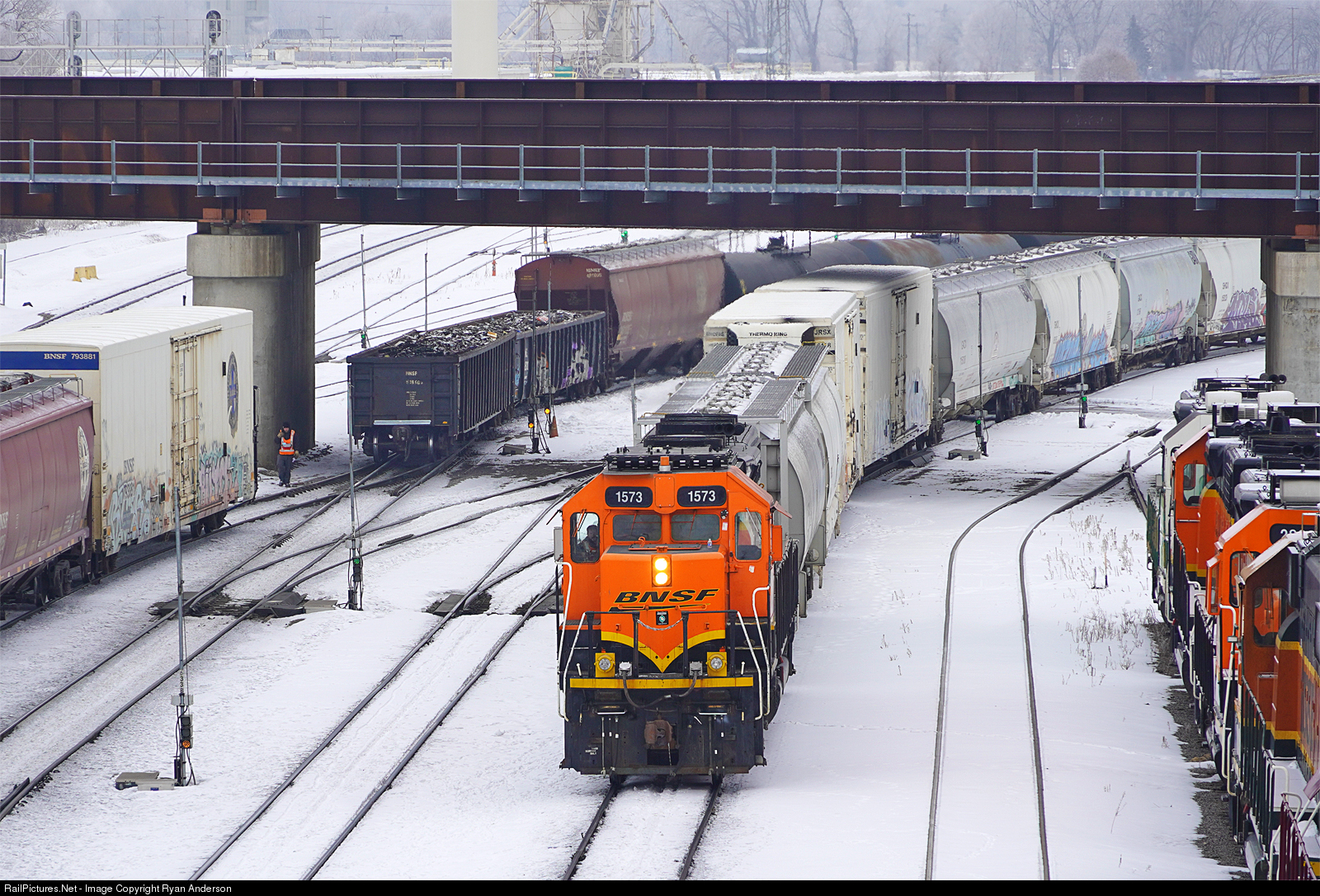 The crew of BNSF 1573 continue to operate normally while the crew of BNSF 1913 react to a sudden mishap. A worker inspects two car that broke apart with a loud band while the engine was shoving the cars into the yard. With nothing derailed or broken from my vantage point, they appeared to recouple and continue on.