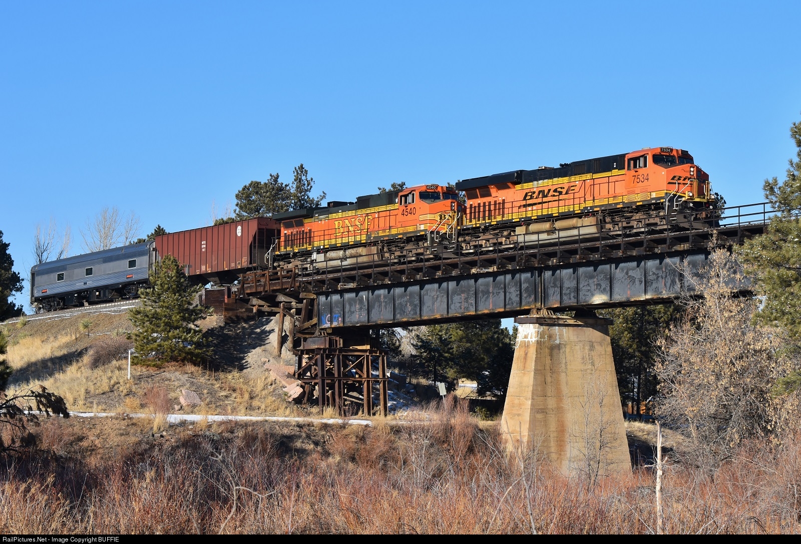 | BNSF 7534 (ES44DC) leads a geo train consist over the Santa Fe Bridge in Larkspur, Colorado. The slow moving train checked track conditions on the Joint Line from Sedalia to Monument. |