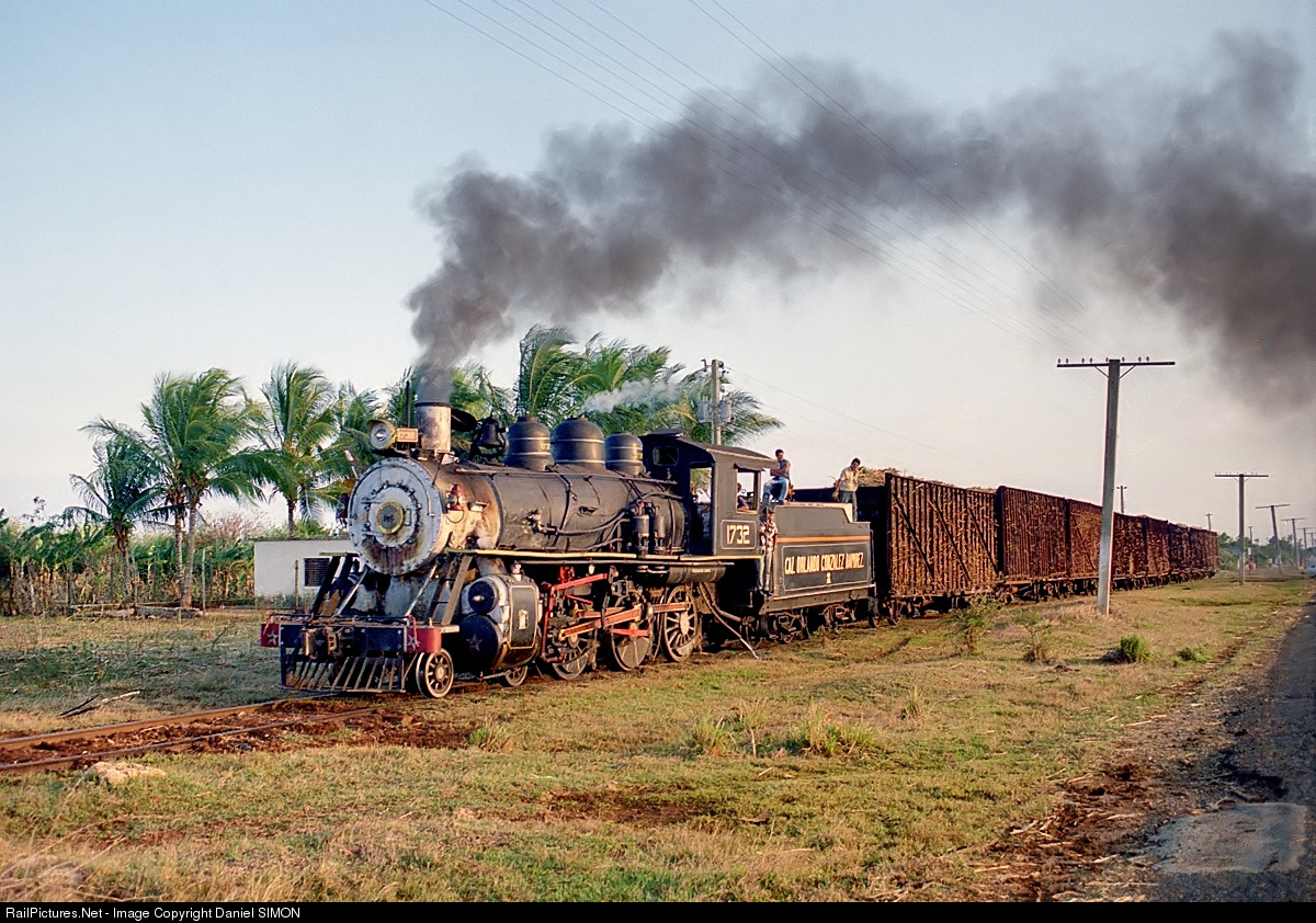 | Minaz #1732 is returning to the Orlando Gonzales Ramirez sugar mill with a late afternoon loaded cane train. The ten wheeler has been built by Alco in 1916. It has been delivered new as #243 to the Cuba RR. |