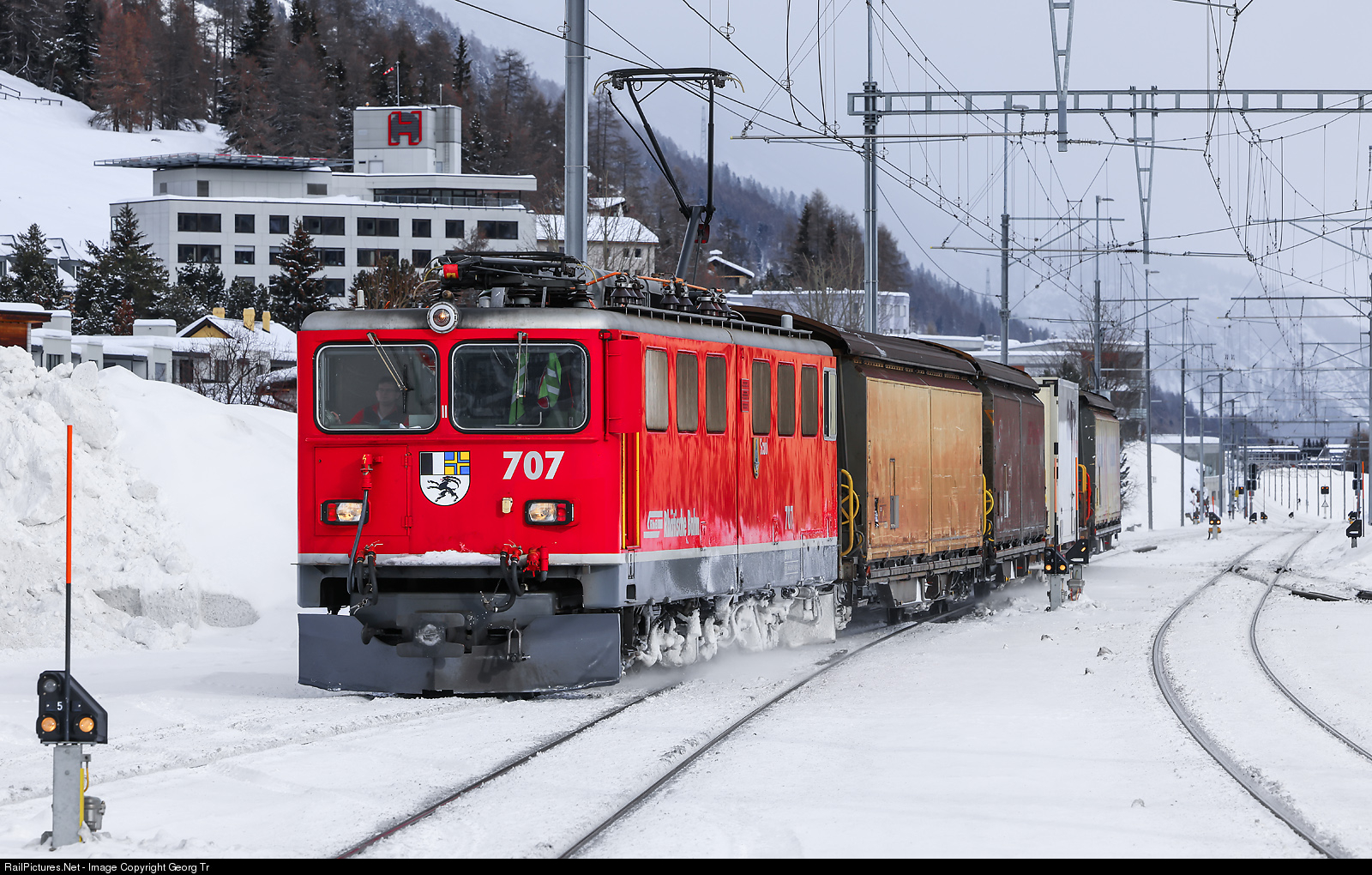 Ge 6/6 II # 707 "Scuol" of the Rhaetian Railway, built in 1965, is entering Samedan with the freight train 5329 from Chur GB via Landquart-Vereina-Zernez. This series is due to be withdrawn in 2021, 4 out of 7 are operational yet (# 702, # 703, # 704 and # 707).