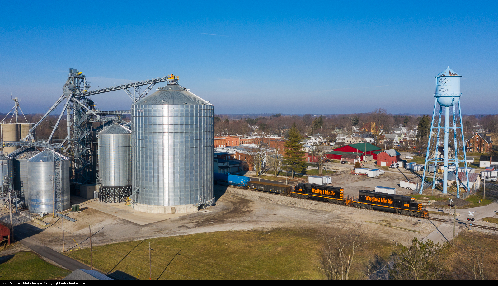 A pair of Wheeling & Lake Erie SD40-2's lead train 430 as it heads east over the CF&E, passing through the Village of Nevada, Ohio. The large elevators of Mennco Grain stand at left, dominating the skyline of the small town.