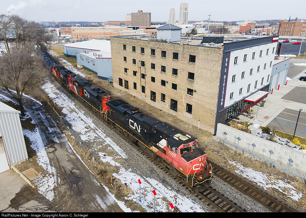 CN 2242 heads up M396 as it passes by the old Norman Foods building. 86 South Division had an makeover when it was purchased and is now home to Schweitzer Inc. a building contractor.