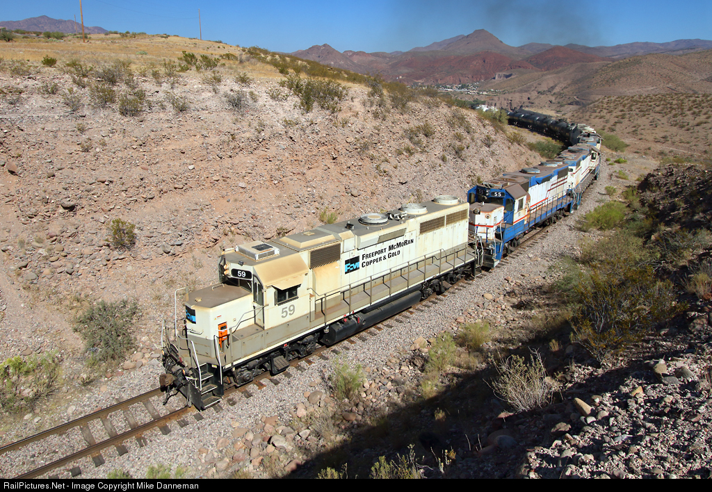 Working hard on the steep grade out of Clifton, Arizona, is a Freeport-McMoRan train of loaded acid tanks curving through Corral cut approaching Corral Road grade crossing on October 23, 2020. Five EMD GP38/38-2s power the train, led by FMI GP38-2 No. 59, rebuilt former Rio Grande GP40 No. 3075 that has done plenty mountain climbing during its lifetime. Behind No. 59 is a trio of units still wear the blue, white and red colors of former owner Phelps-Dodge.