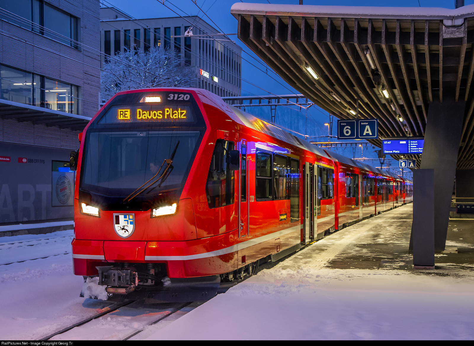 | The new "Capricorn" train ABe 4/16 # 3120 of the Rhaetian Railway, built by StadlerRail, is ready in Landquart with the Regio Express 1021 to Davos Platz. The coat of arms of the canton of Graubünden is illuminated from behind on these trains. |