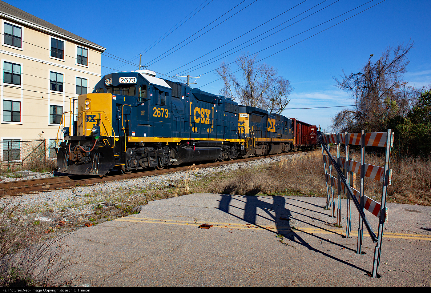 | CSXR GP38-2 #2673 leads a shot local through Columbia, SC heading to the yarrd in Cayce. She was built as Louisville & Nashville #6022 in 1979. Sometime after this shot was made, CSX rebuilt her into GP38-3 #2012 |