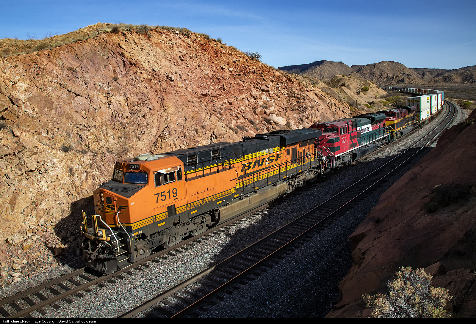 A short, but hot, Z ALTSTO9 (Alliance, TX to Stockton, CA) races through the rock cut near Hackberry with a Ferromex and Kansas City Southern SD70ACe trailing. At 2,500 ft, and 2,000 tons, three motors have no issue getting this little shooter up to track speed of 70 MPH.