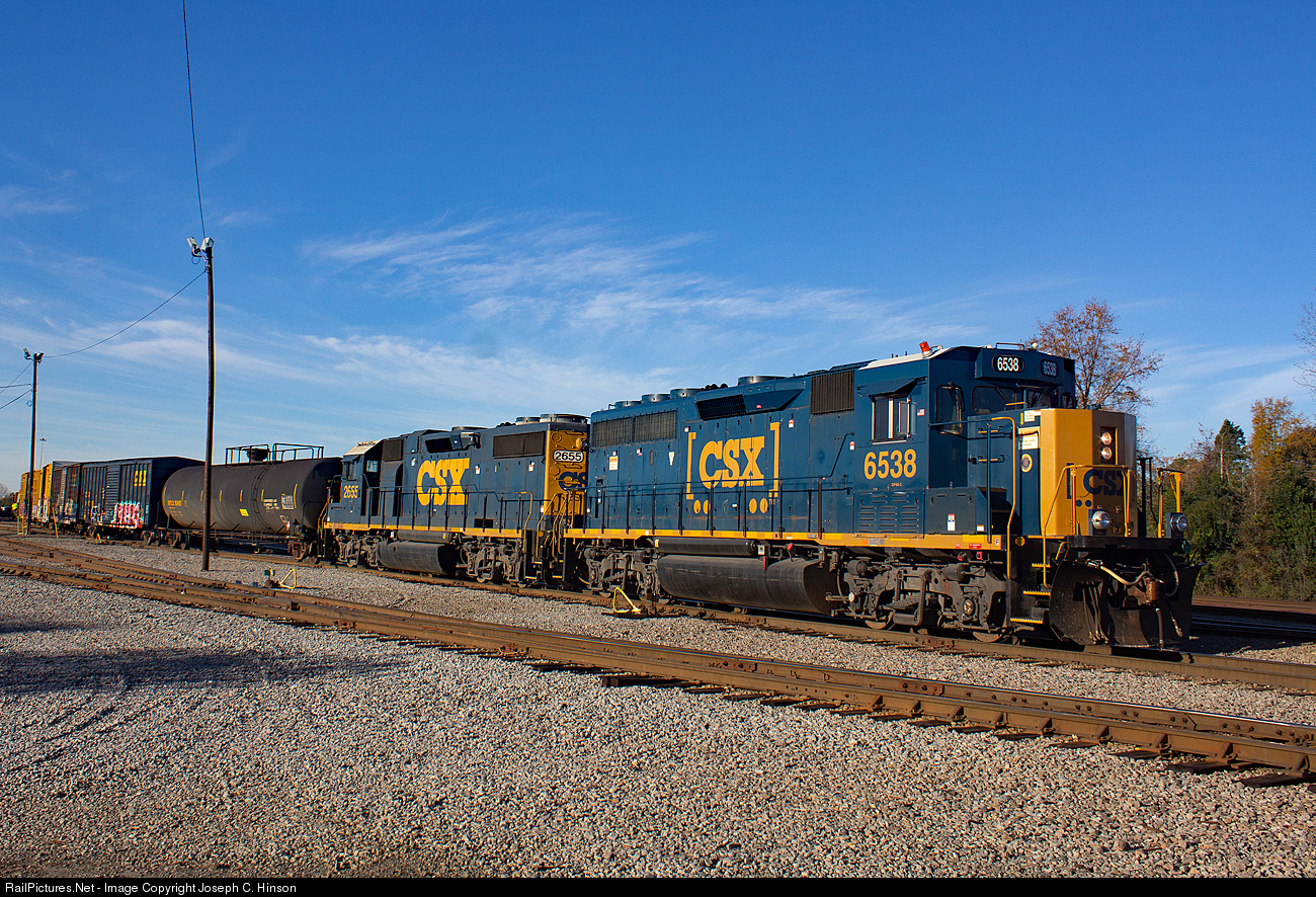 We caught a CSX crew working the old Seaboard Coast Line yard in Cayce, South Carolina on the morning of December 3, 2019 with two four axle locomotives. CSXT #6538 is a GP40-3, a recent rebuild from CSX #6022. It was originally built for the Baltimore & Ohio Railway in 1972 as BO #4122. The second unit is CSXT #2655. She was built as Clinchfield Railroad (CRR) GP40-2 #6004, to Seaboard #6004 and then CSXT #2655.