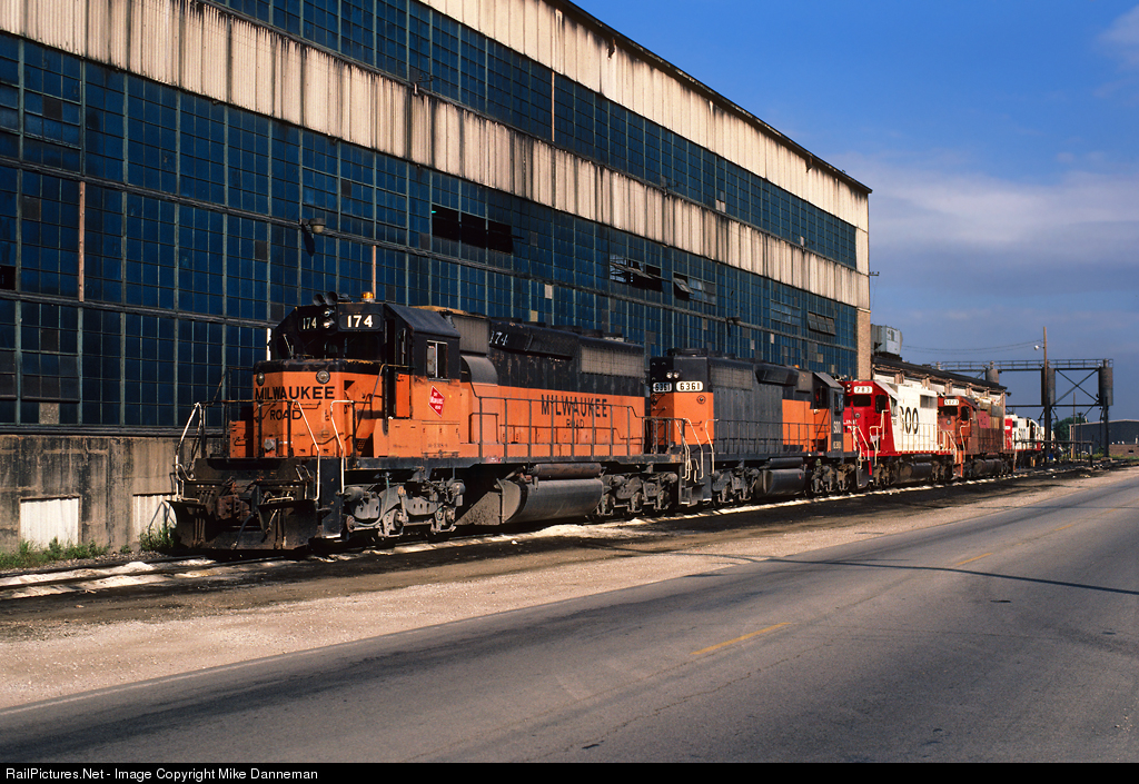 Milwaukee Road, Soo Line and Helm Leasing locomotives sit alongside the enginehouse at Soo Line’s Bensenville Yard locomotive facility, along Green Street in Bensenville, Illinois, on September 13, 1987. Behind Milwaukee Road EMD SD40-2 No. 174 is Soo Line No. 6361 in ‘bandit’ colors, a former Milwaukee unit in the road’s final paint scheme. Patched Milwaukee power on the Soo was not particularly attractive or well done, as readily seen on No. 6361.