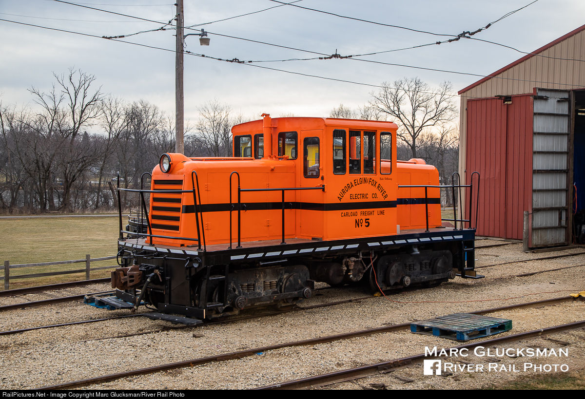 Aurora, Elgin, and Fox River 5 (GE 45T) is original to the operation of the line that became the museum. It is seen at the Fox River Trolley Museum in Elgin, Illinois on Sunday, December 27, 2020