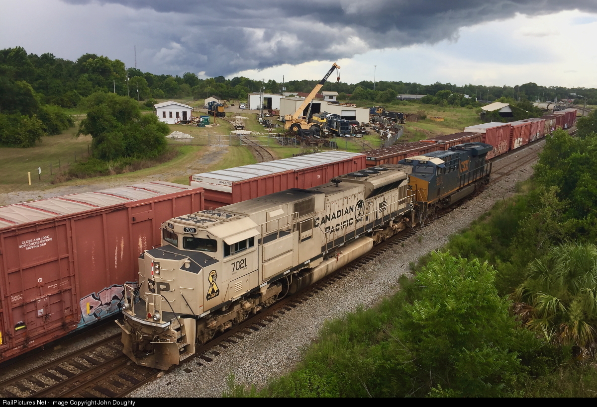 As a severe thunderstorm rolls into Waycross, CP 7021 and CSX 3113 are backing to their train of 91 phosphate cars after dropping off 71 cars in the CSX Rice yard.
