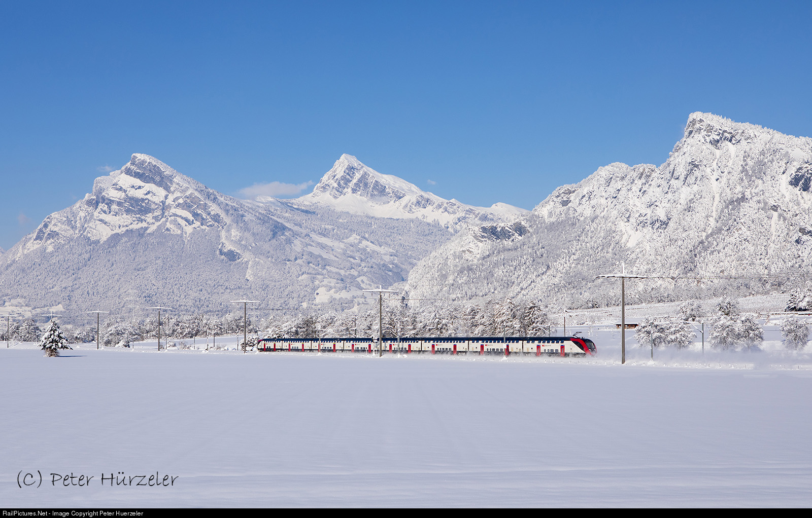 | After two days of heavy snowfall in the eastern part of Switzerland a sunny day revealed a real winter wonderland. Here we see RABe 502 209 passing Maienfeld on it's journey as Intercity IC568 from Chur to Basel.