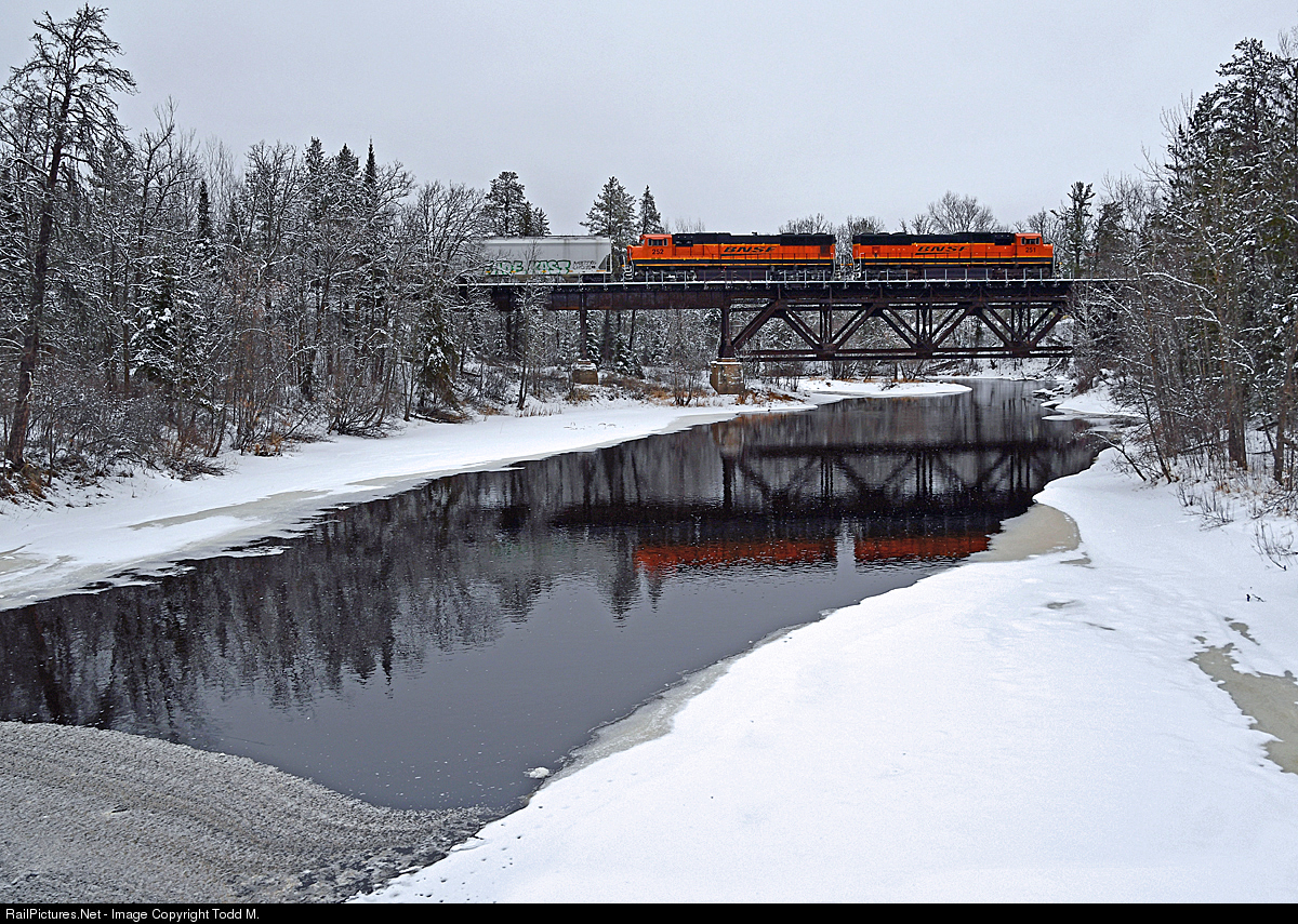 After passing through Grand Rapids, MN BNSF 251 and 252 continue east on the BNSF Lakes sub passing over the Prairie river with their manifest train in tow.