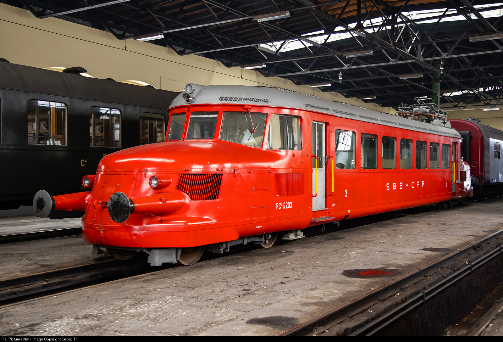 "Red arrow" RCe 2/4 # 203 of SBB Historic, usually exhibited in the Swiss Museum of Transport (VHS) in Lucerne, in the moment stabled in the depot of Arth Goldau. This railcar with 404 kW and a maximum velocity of 125 km/h was built in 1936 as CLe 2/4 # 203. Withdrawn in 1968, then designated as RBe 2/4 # 1003, and optical renovated for the VHS (not operational).