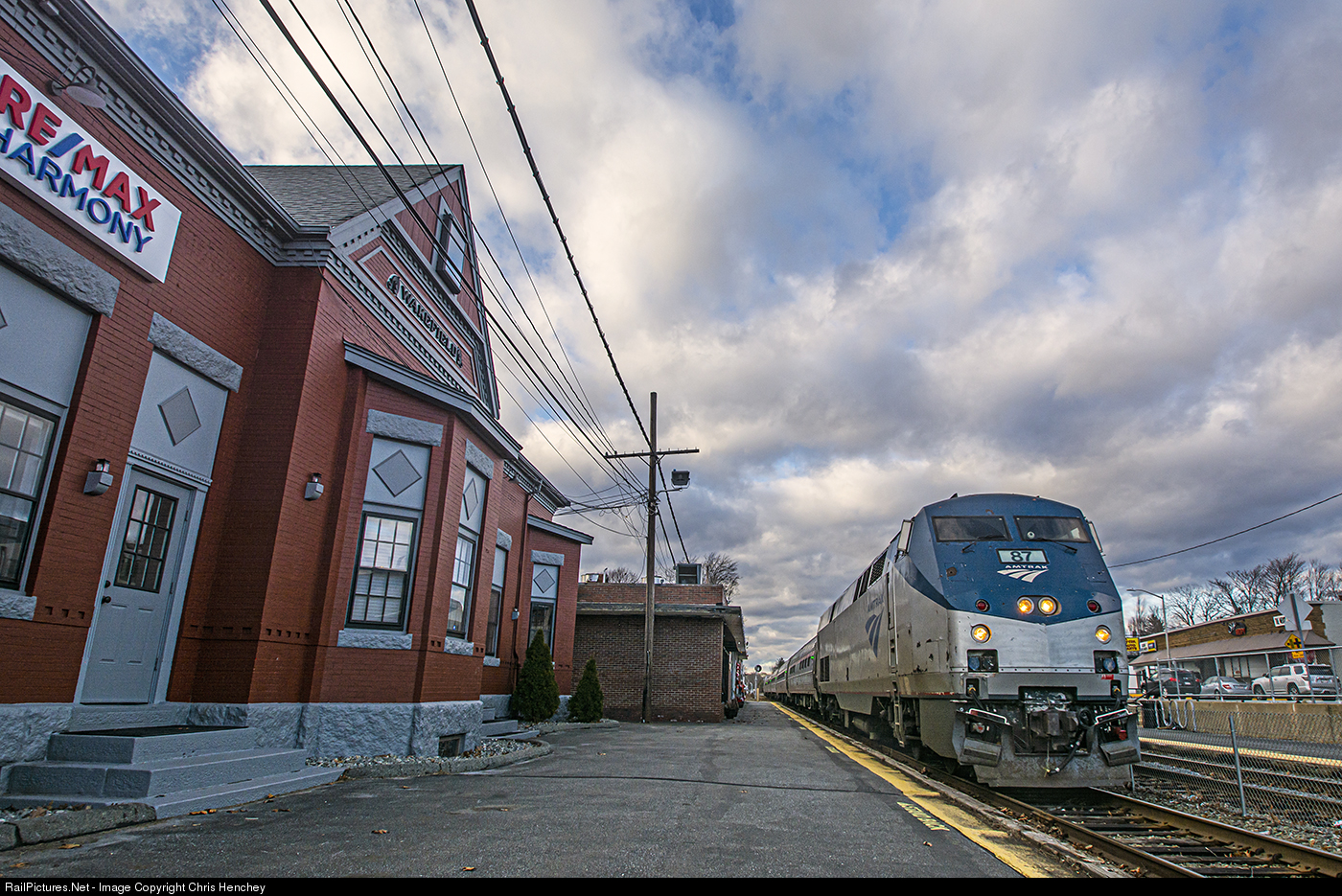 | A Downeaster on the Western Route south of Wilmington Junction is rare enough, but a Downeaster with P42 on each end on the Western Route south of Wilmington Junction may as well be a Halley's Comet sighting. Downeaster 694 rolls past the former B&M station building at Wakefield Station with engine 87 in the lead on a chilly January afternoon. |