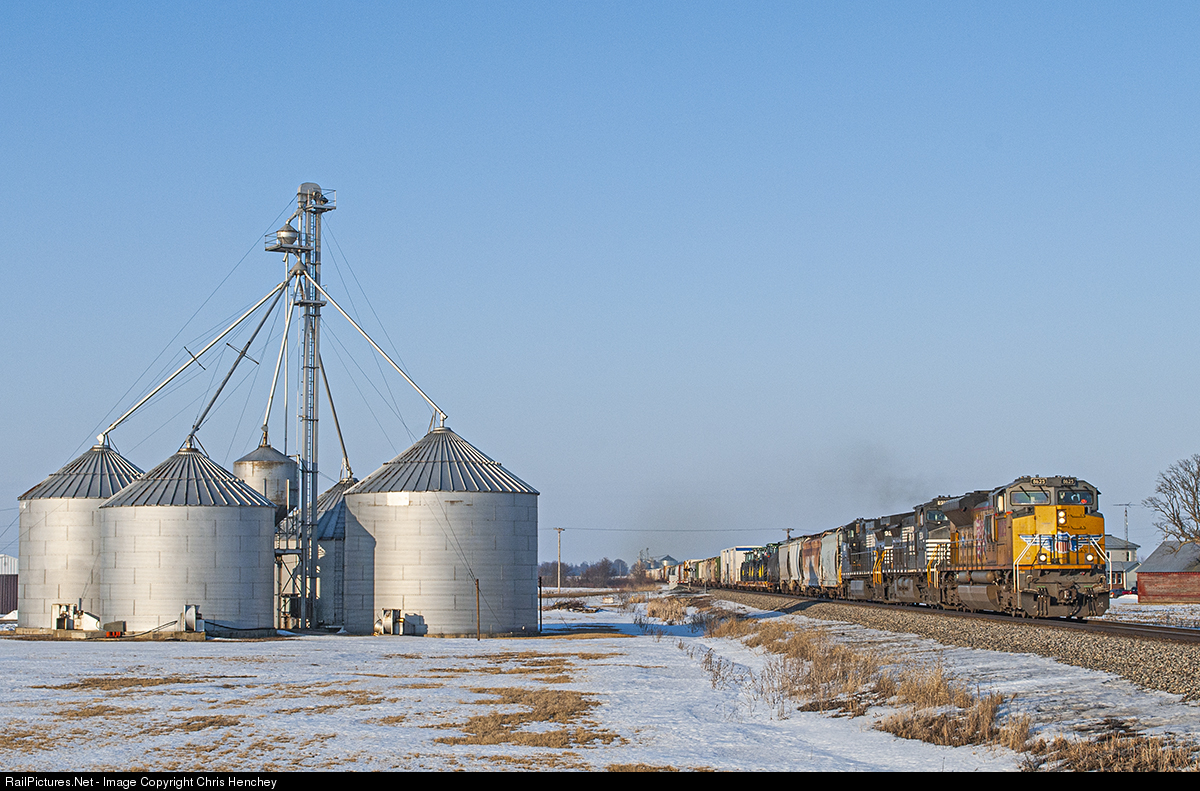 | NS Manifest 18A with foreign power in the lead rolls past one of the many local grain silos on the Sandusky District as it heads towards Marion on a late March afternoon. |