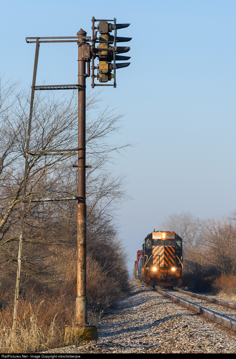 | A PRR position light signal stands turned away from the tracks as Wheeling & Lake Erie 430 approaches on its eastbound run down the CF&E's Lima Sub. This signal is one of the 242.7/8 Intermediate signals located east of Ada, Ohio on the PRR Fort Wayne Line. |