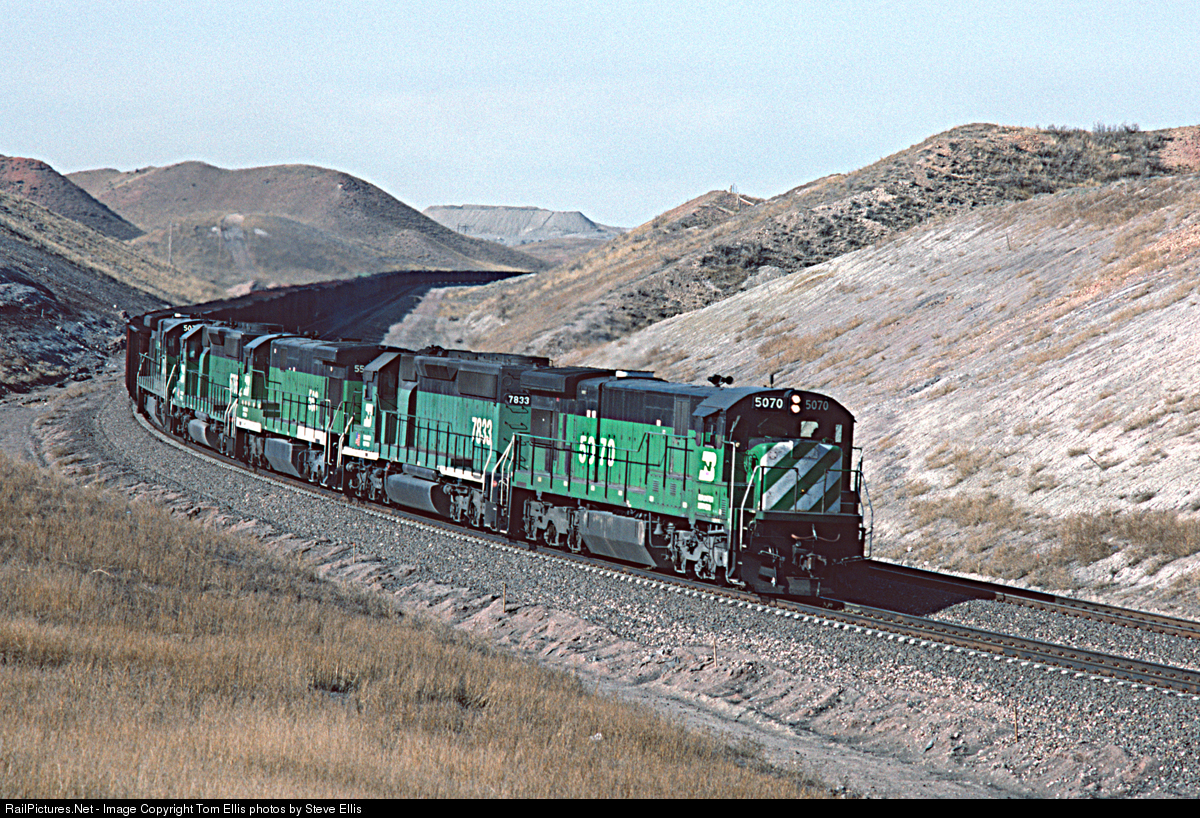 | Representing both makes on this Burlington Northern coal train, C30-7's and SD40-2's. GE, EMD, GE, EMD, GE. Tom Ellis photo. |