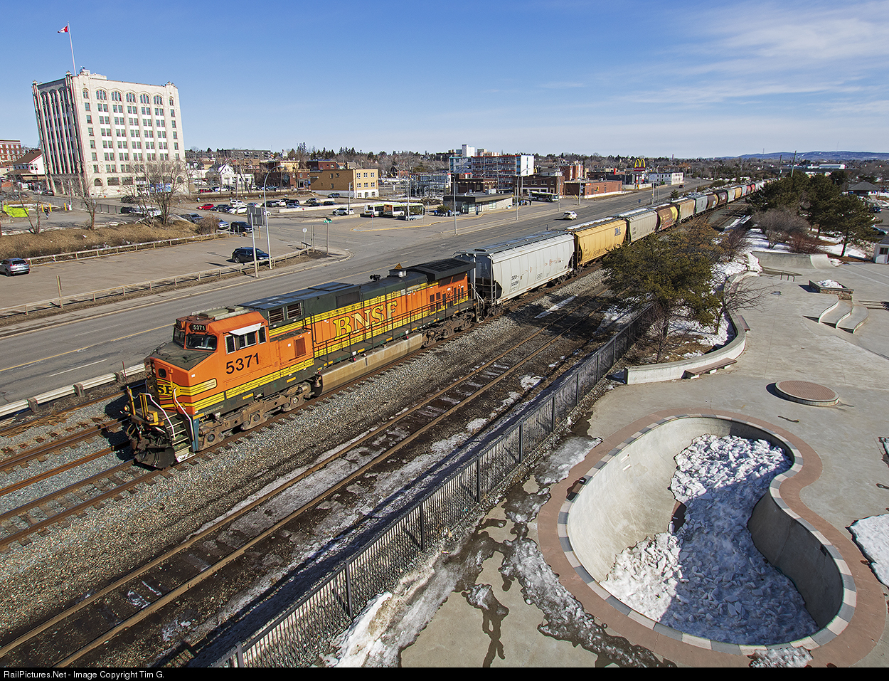 | An unusual and welcome visitor to Northwestern Ontario leads grain empties up the south track (evidence of the steel gang work block on the adjacent north main) and passed the skateboard park on the revitalized Thunder Bay waterfront and downtown Port Arthur. |