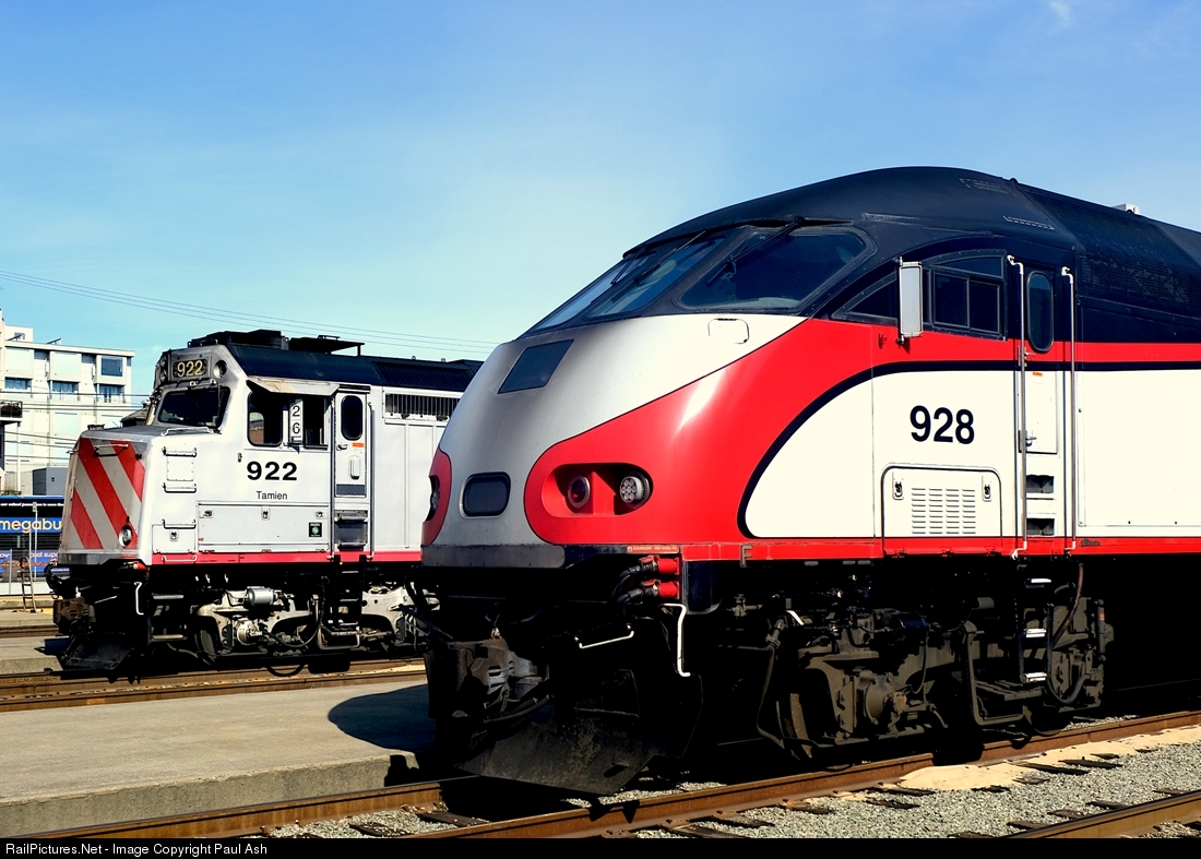 CalTrain MPI MP36PH-3C 3 #928 and F40PH-2C #922 at San at the San Francisco Station on a sunny February morning in 2018.