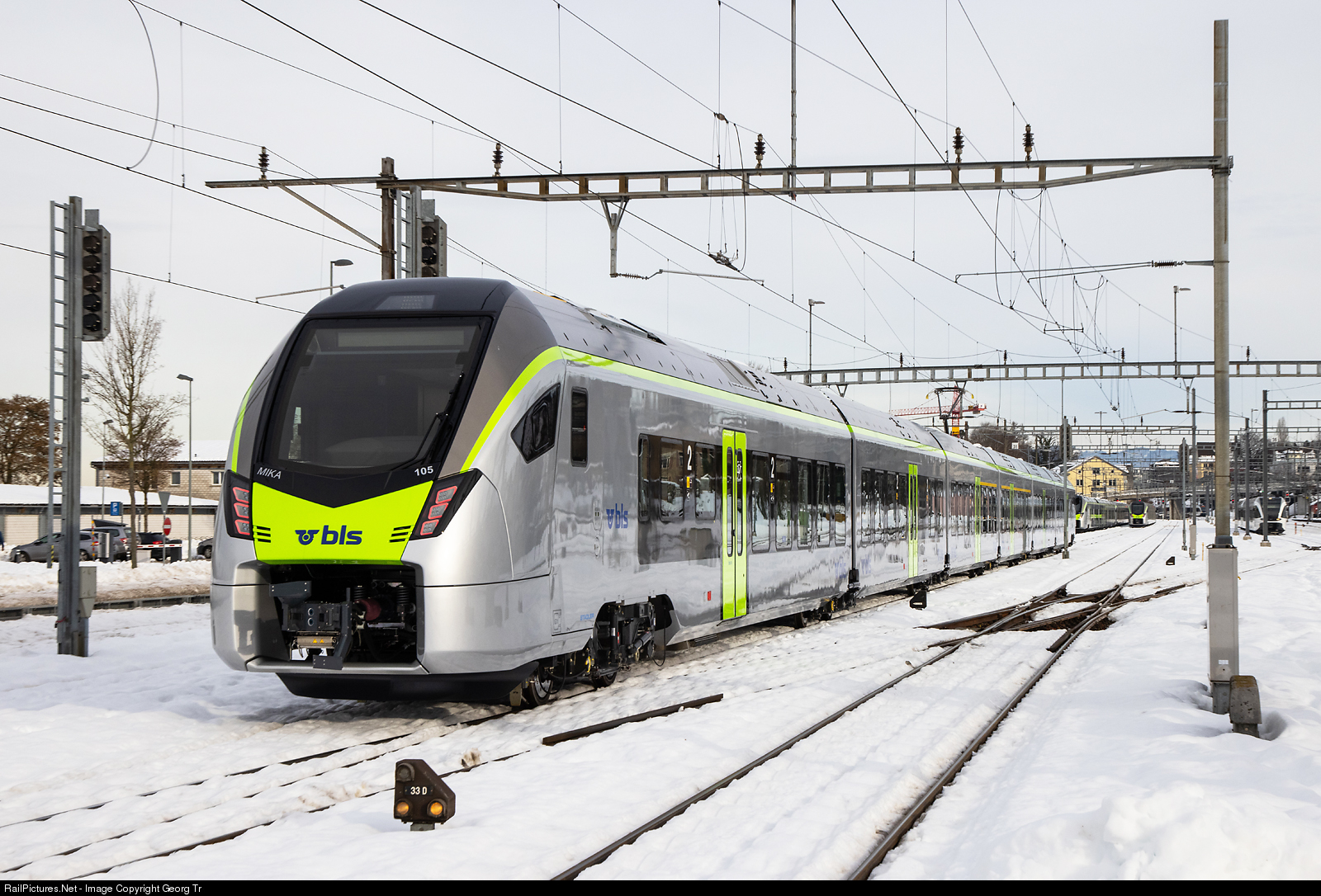 New "Flirt" train for the BLS, called MIKA (moderner, innovativer, kompakter Allroundzug), RABe 528 # 105 in Rorschach freight yard during tests on behalf of StadlerRail. The BLS ordered 58 of this 6-car "Flirt 4" trains.