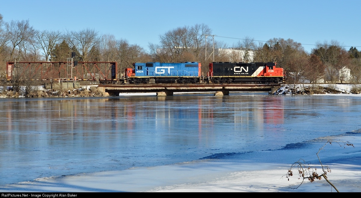 Not a heritage unit - IC 3129, in contemporary CN colors, leads GT 4924, still in GTW colors, across the White River at Burlington, WI. The pair powers the Waukesha switch run and will switch several customers in Burlington before returning back to/ Waukesha.