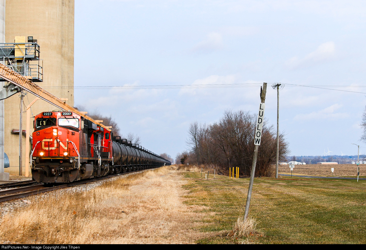 | Canadian National 2237 leads a south bound U train on the CNs Chicago Subdivision formerly the Illinois Central mainline to New Orleans at Ludlow passing the station sign of IC heritage. |