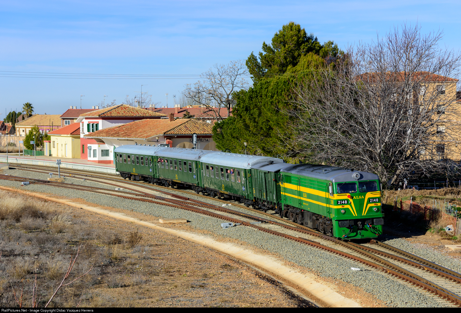 To celebrate the 20th anniversary of PTG tours, in collaboration with ALSA RAIL, a hundred Britons went to Spain to visit two of the most beautiful lines in the country. In charge of the historic train, the ALCO 2148 of the old RENFE 2100 series, coming from the ALCo DL-500 model, restored by Alsa. In the photograph, the train is passing Cariñena station.
