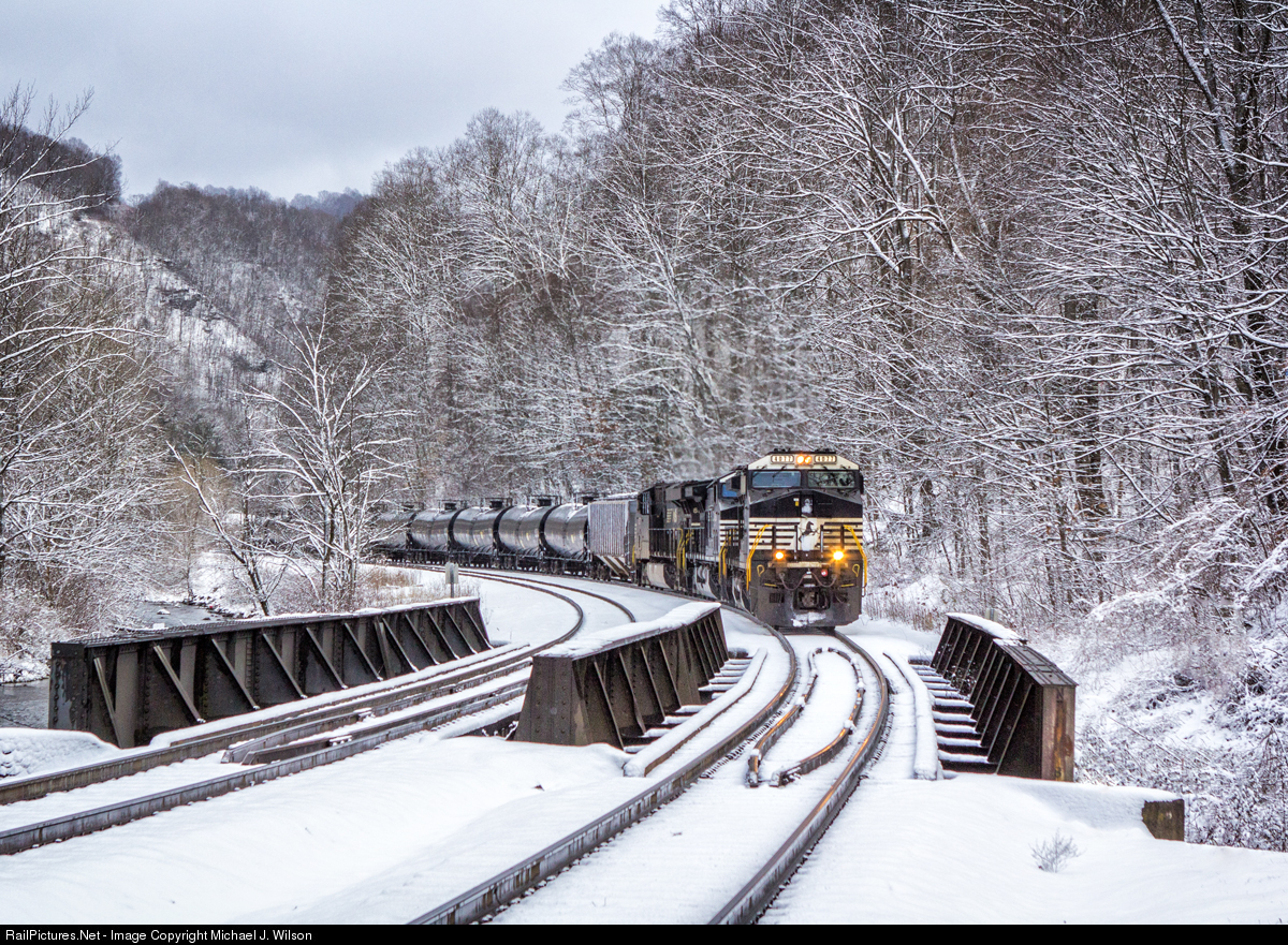 | A friendly engineer greets the photographer near Vivian, WV on January 16, 2021 as NS #4077 is shoving hard together two other units on the rear of our loaded ethanol train. Lots of traffic on this division recently has provided shiny railheads for plenty of head and ditch light glint. |