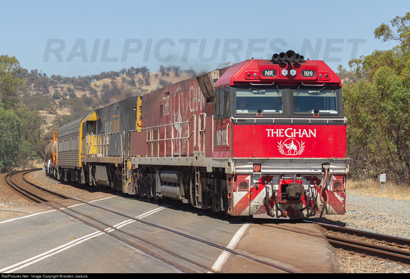 NR109 wearing the Ghan MK3 livery and with NR6 trailing powers over River Road in West Toodyay with 7PX4 steel train.