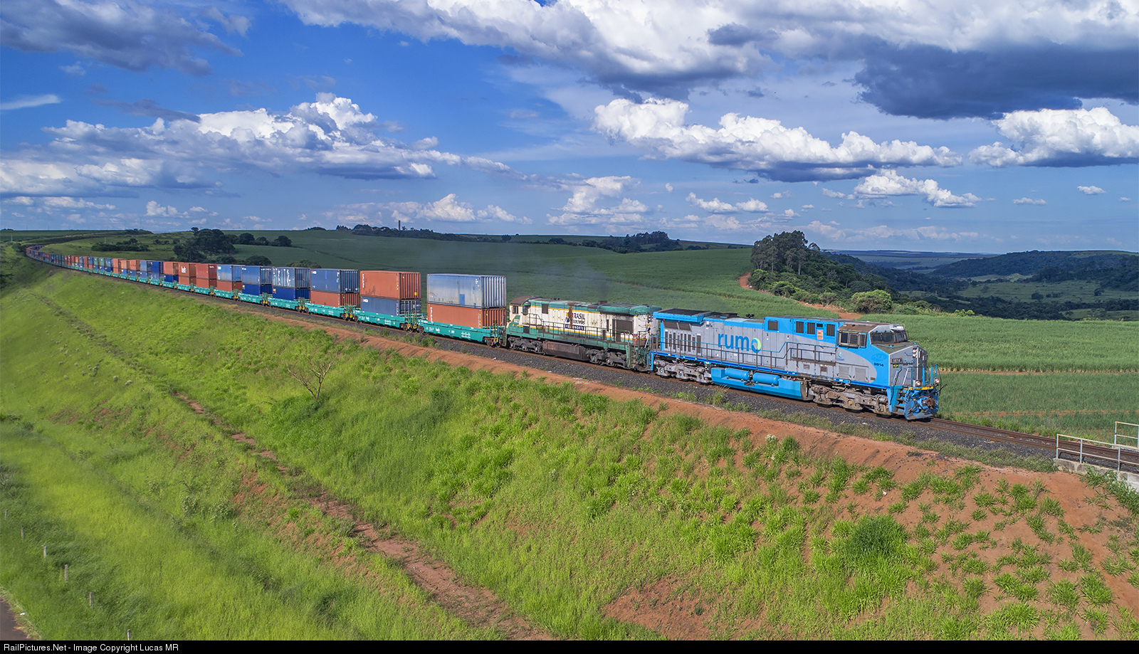 Doublestack train D76 led by AC44i #9814 (one of the fisrt ones received by Rumo) photographed at Araraquara railroad loop, between Tutóia and Ouro yards.