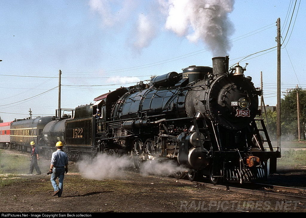 | Retired in 1951 and donated to the Museum of Transportation in St. Louis, SLSF 1522 underwent a 3-year restoration beginning in 1985. In one of its first excursions, the 4-8-2 "Mountain" is on the Wisconsin Central in Schiller Park. Tom Golden photo. |