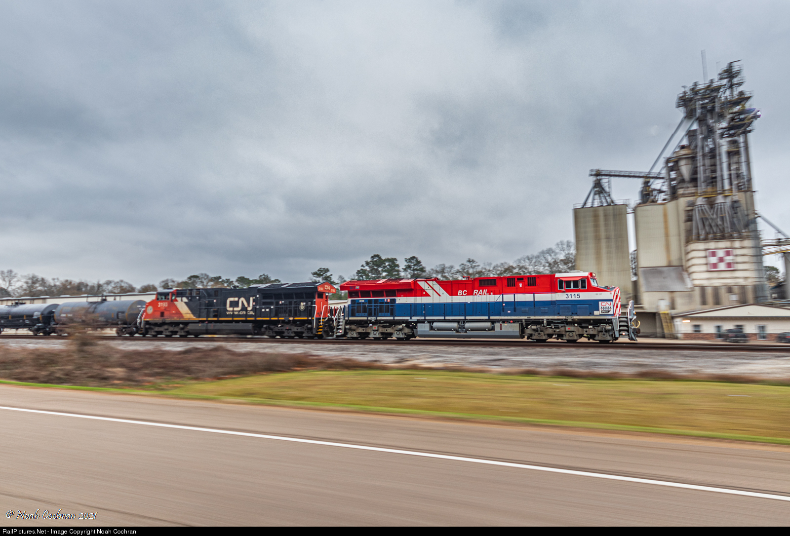 Pacing CN A420 through Arcola, LA with CN 3115 on point, CN's Bc Rail heritage unit. CN 3115 CN 3193