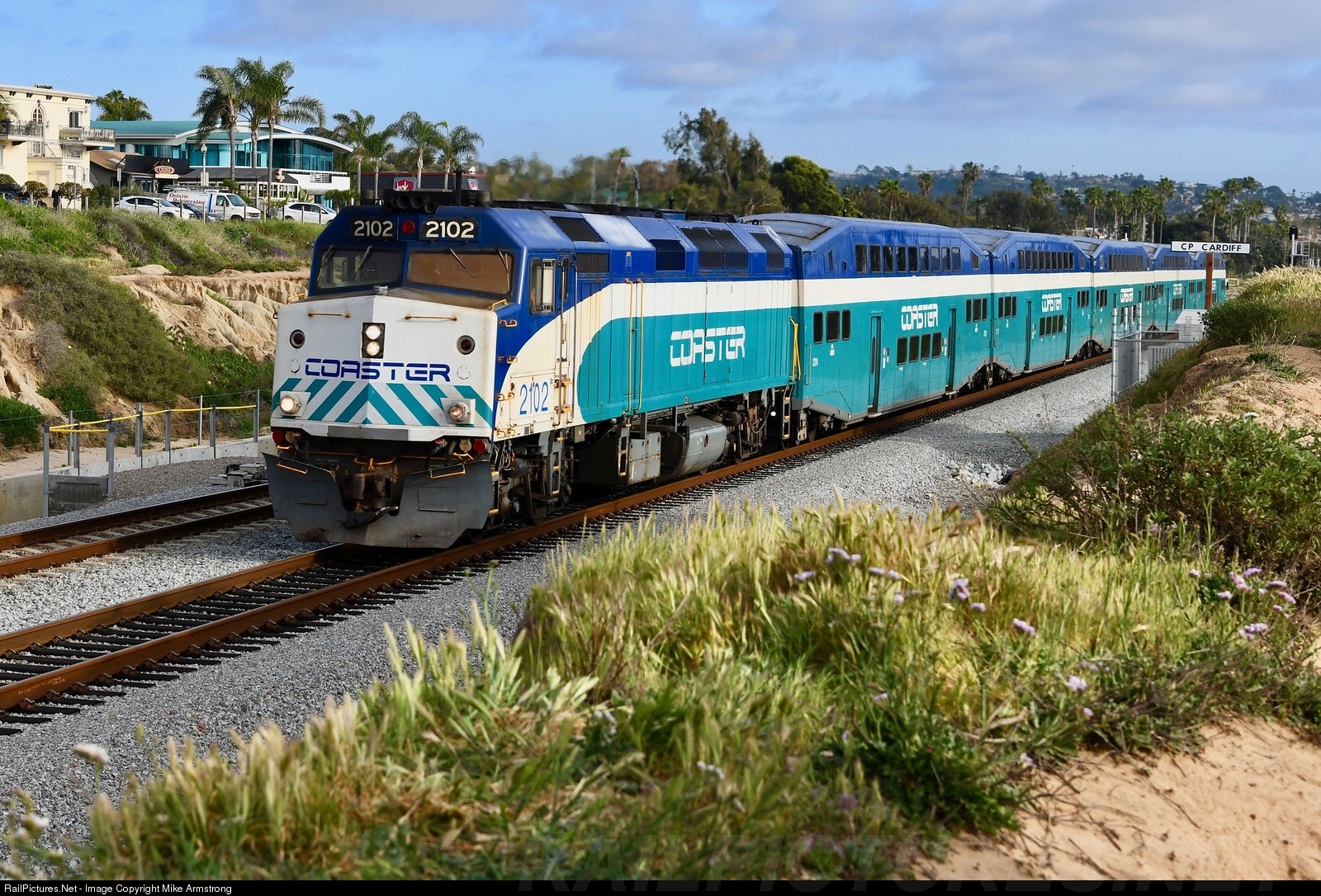 Cosating Through Spring: A northbound Coaster commuter train glides through Cardiff behind F40PHM-2C number 2102. The 2102 and 4 other F40s used for Coaster service were just into their final year of operation at this point. February 2021 marks an end to nearly 26 years of commute F40s in San Diego County.