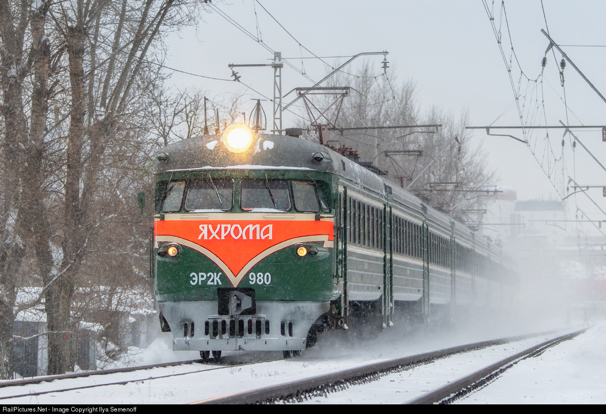 | The last green USSR colors ER2K-980 EMU train runs from Moscow to Yakhroma. The electric train was built in 1972. This design (with round shape head coach) was trendy in the middle of the 20th century and now is very revered among railway fans. Currently, there are only few trains with such design in Russia. In December 2020 Russian Railways began service of this train like a tourist train restored to take skiers to ski resorts of the Moscow region. |