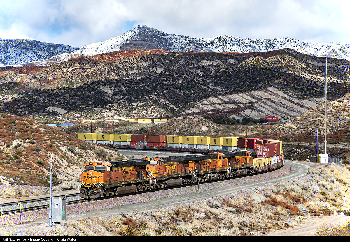 Winding through the S-curve at Mormon Rocks in Cajon Pass, BNSF Intermodal Stacks train S-ALTLBT1-21 makes it way from Alliance, Texas, to the Port of Long Beach’s Pier T. They typical quartet of General Electric engines (in this case, ES44DC 7849, Dash 9-44CW 5116, ES44DC 7244 and ES44C4 8114) is powering this train, fighting gravity as the train descends the 2.2% grade over its last formidable obstacle before arriving alongside the Pacific Ocean in a couple of hours. Just a few hours earlier, snow was still falling in the Pass, but by the time this train passed, at 11:36 am, most of the snow in the lower elevations had retreated to just the shadows, even with a 34ºF (1ºC) temperature. (Cajon Pass, California – January 25, 2021)