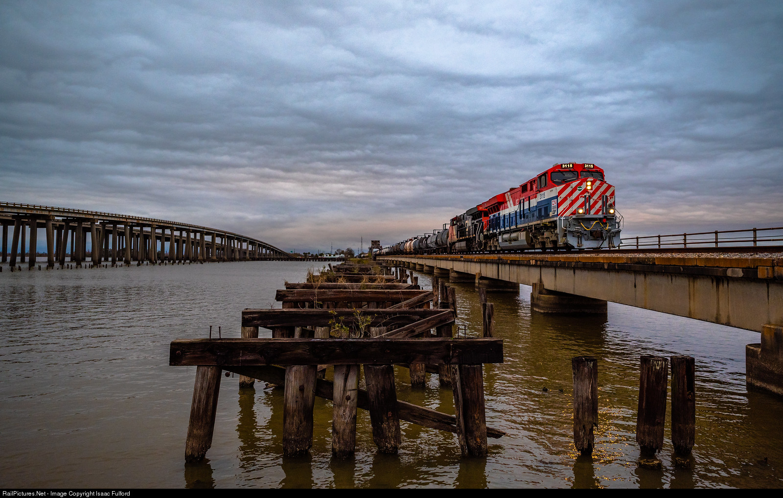 Late Day at Manchac Pass. CN A420 has made great time south on the former IC out of Jackson, which allowed us to thankfully shoot it on the Manchac Pass bridge. Manchac Pass is the narrow Bayou that connects Lake Maurepas to Lake Ponchatrain on the northeast extremities of the Nola region. Soon the train will roll over the eastern pass of the Bonnet Carre Spillway and round the tight curve at Orleans JCT as they head to Geismar via Destrehan. The BC rail may be one of the most out of place engines in Louisiana swampland, but it sure looked great as we approached dusk with water on all sides. Thanks for looking and enjoy!