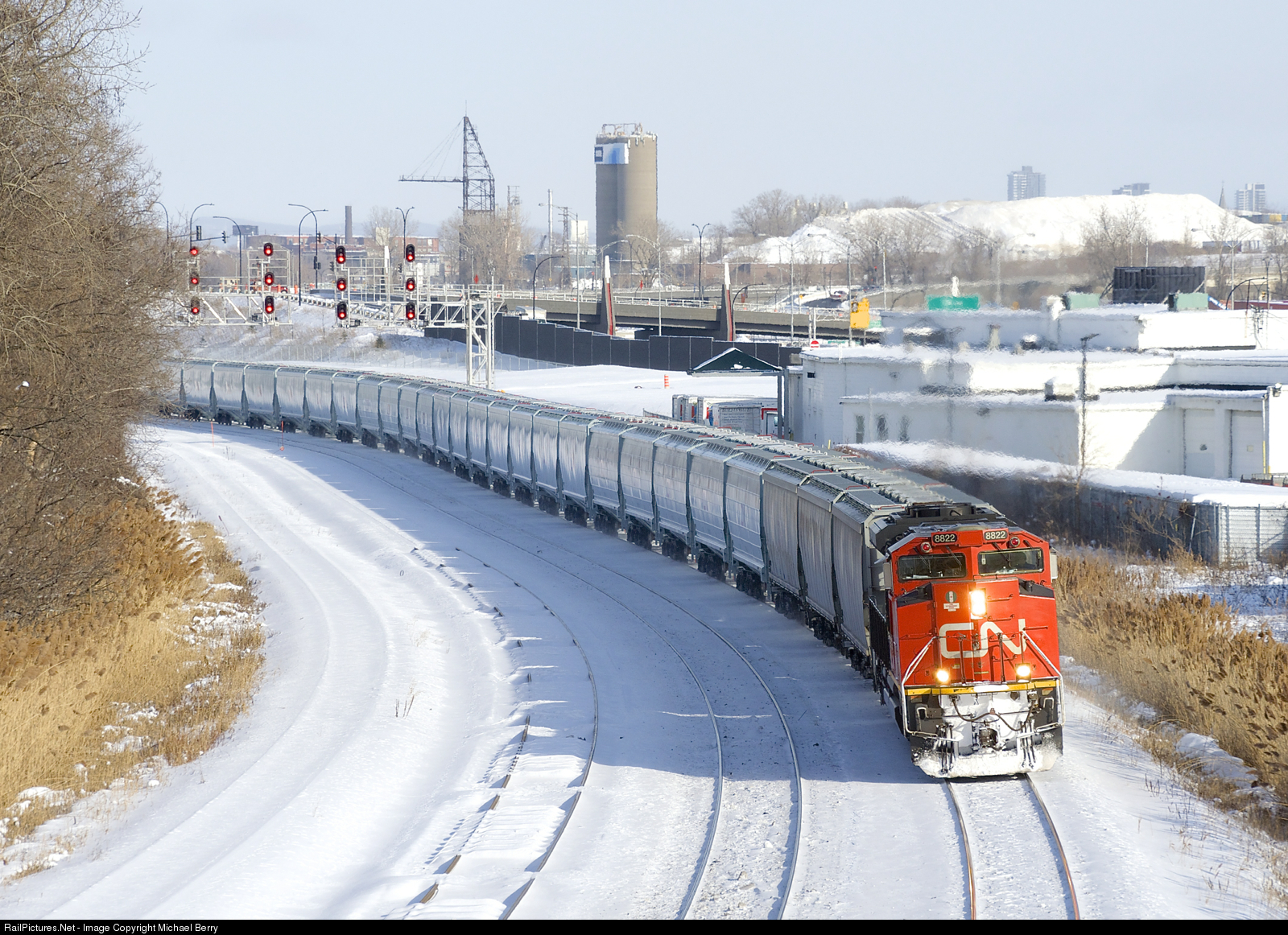 | Empty potash train CN 731 has just departed Turcot Ouest with a new crew as it passes under a pair of signal gantries. About half of the train is comprised of grain empties, with new CN hoppers up front. |
