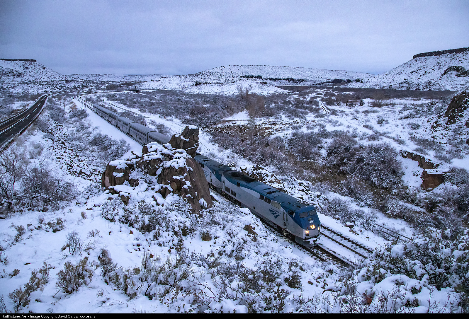 The train stopped in Seligman at 1030 where a new BNSF pilot will arrive to take over piloting duties. While that is happening, another Amtrak crew from Kingman has to be called due the first LA crew running out of hours of service. The second LA crew will have to take a train to Seligman as well as the road conditions are still not safe for travel. Finally, Amtrak is on the move west at 1650.