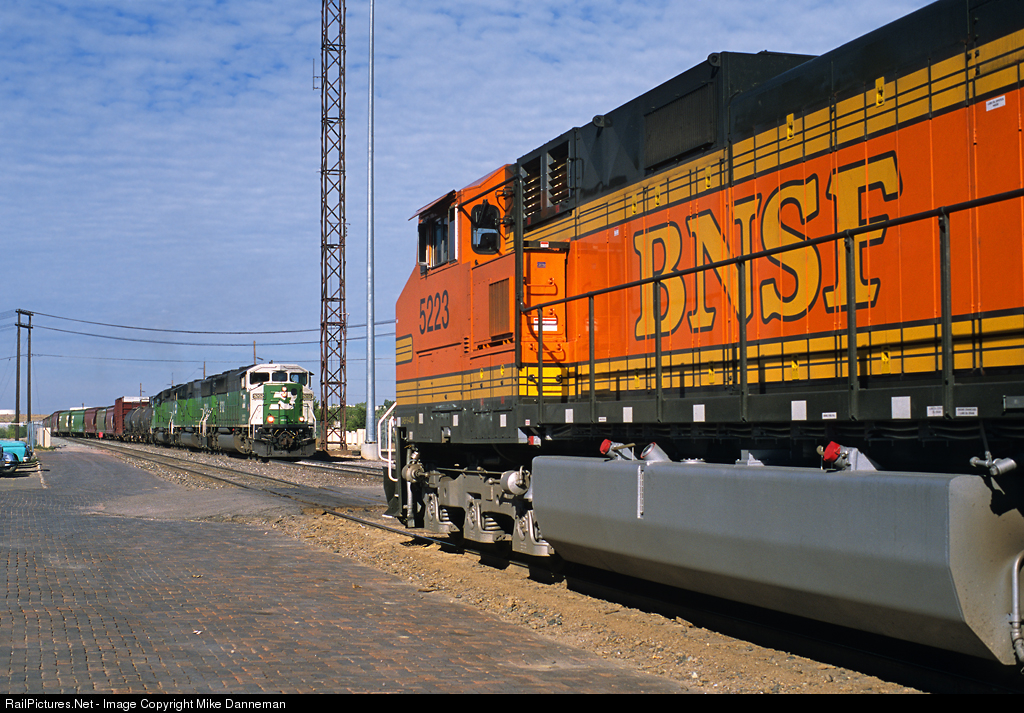 A northbound Burlington Northern Santa Fe freight behind new GE C44-9W No. 5223, waits for the arrival of an eastbound powered by a pair of BN EMD SD60Ms and a Cascade green BNSF EMD SD40-2 at the crew change of Casper, Wyoming, on September 11, 2002.