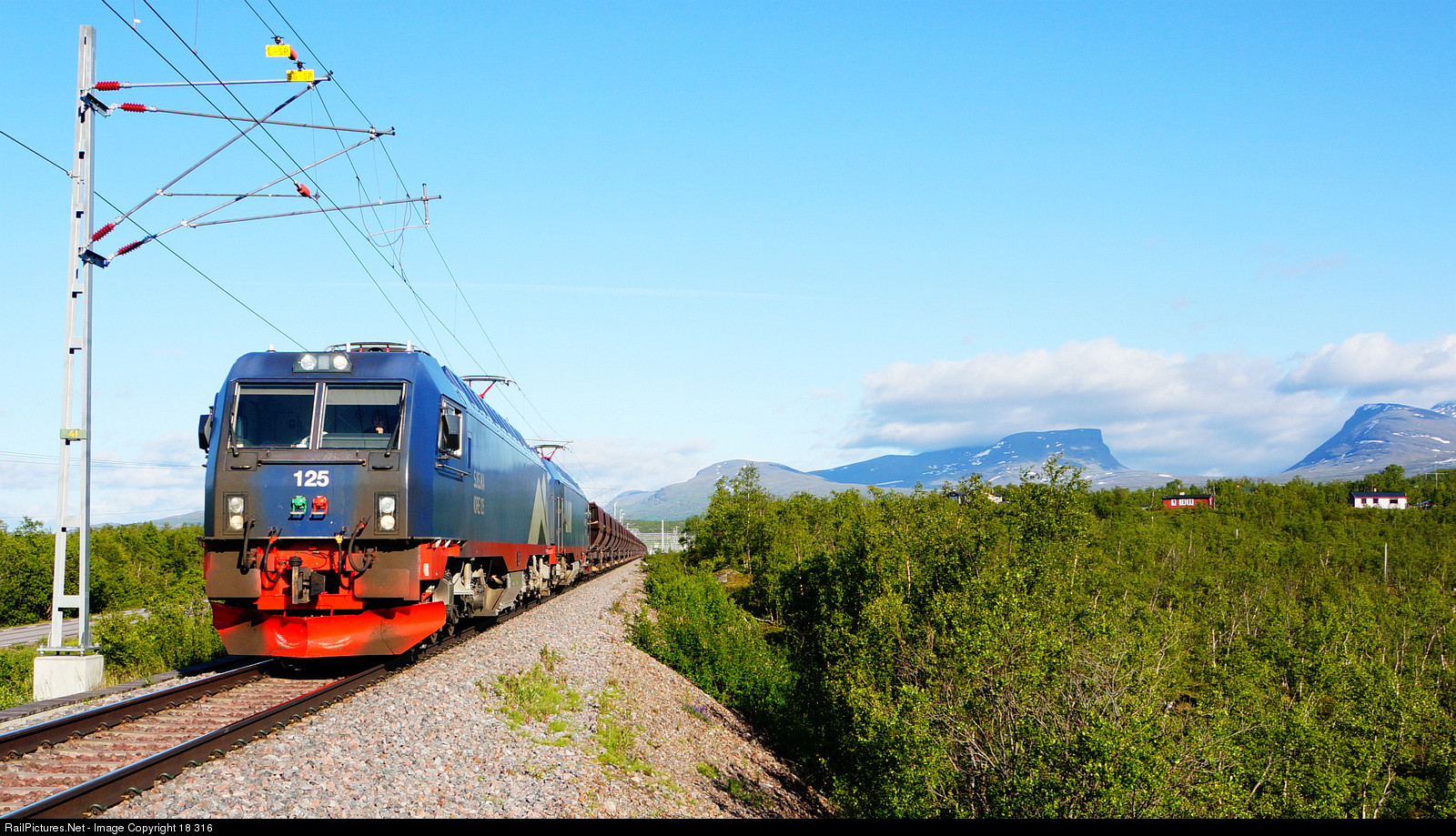 | A standard 68-wagon MTAB iron ore train passes the Lapporten (Lapponian Gate), the landmark of the Abisko region. |